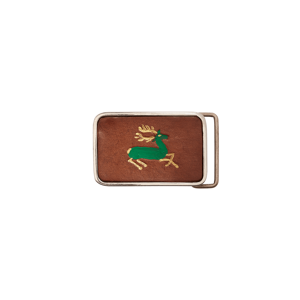 • Rectangular belt buckle in Nickel with inlaid vintage leather with hand stamp and painted deer motif