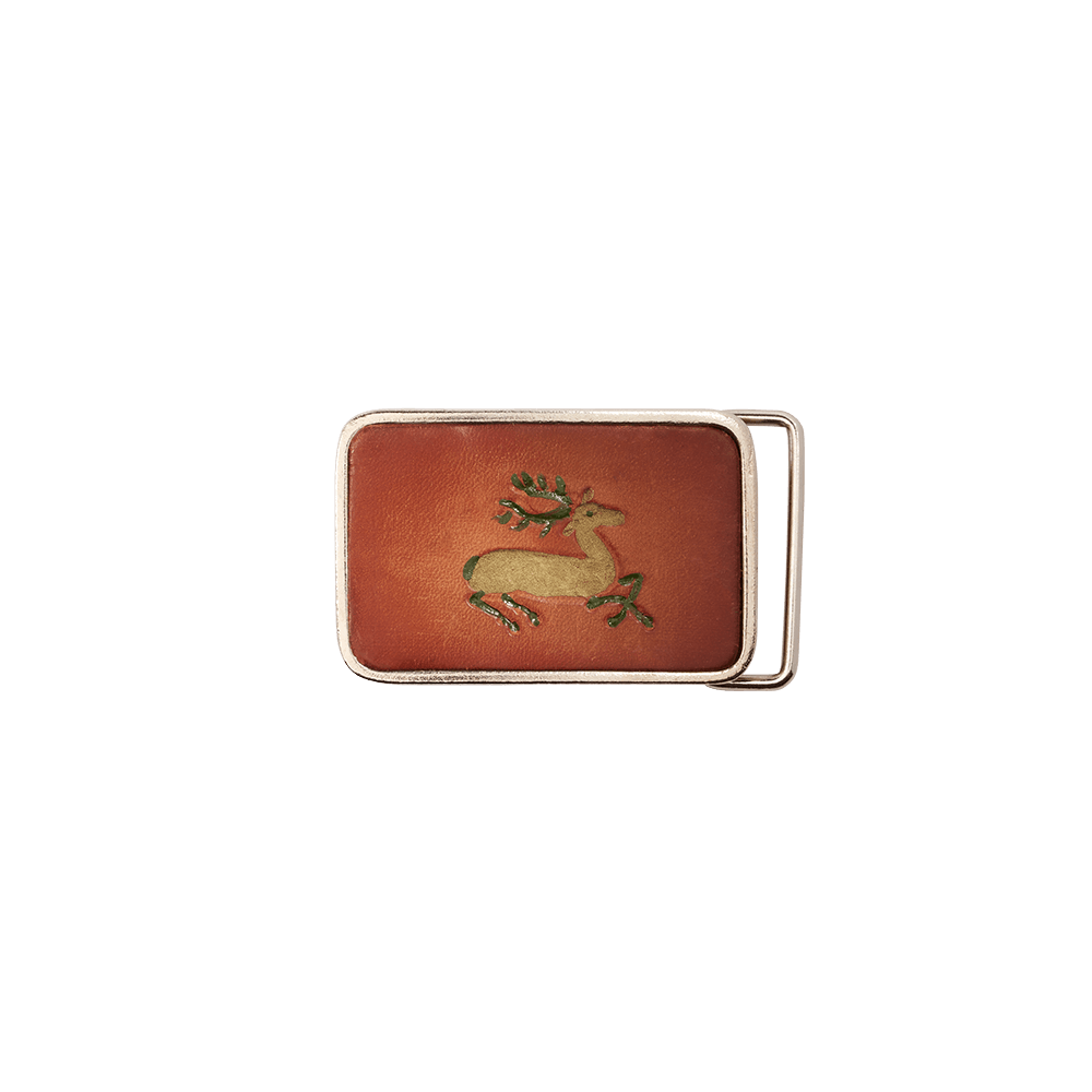 • Rectangular belt buckle in Nickel with inlaid vintage leather with hand stamp and painted deer motif