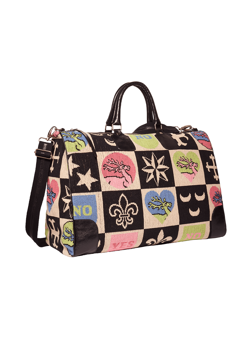 • Large Weekender Travel Tote with needlepoint wool fabric and leather trim