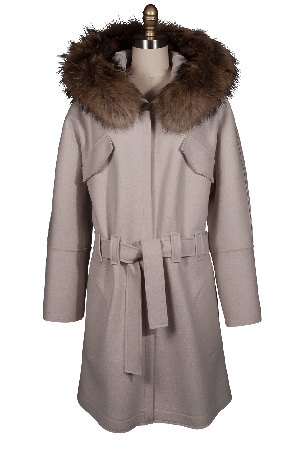 • Knee length wrap Coat unlined in Exclusive Walk Wool with hood in Natural fox trim
