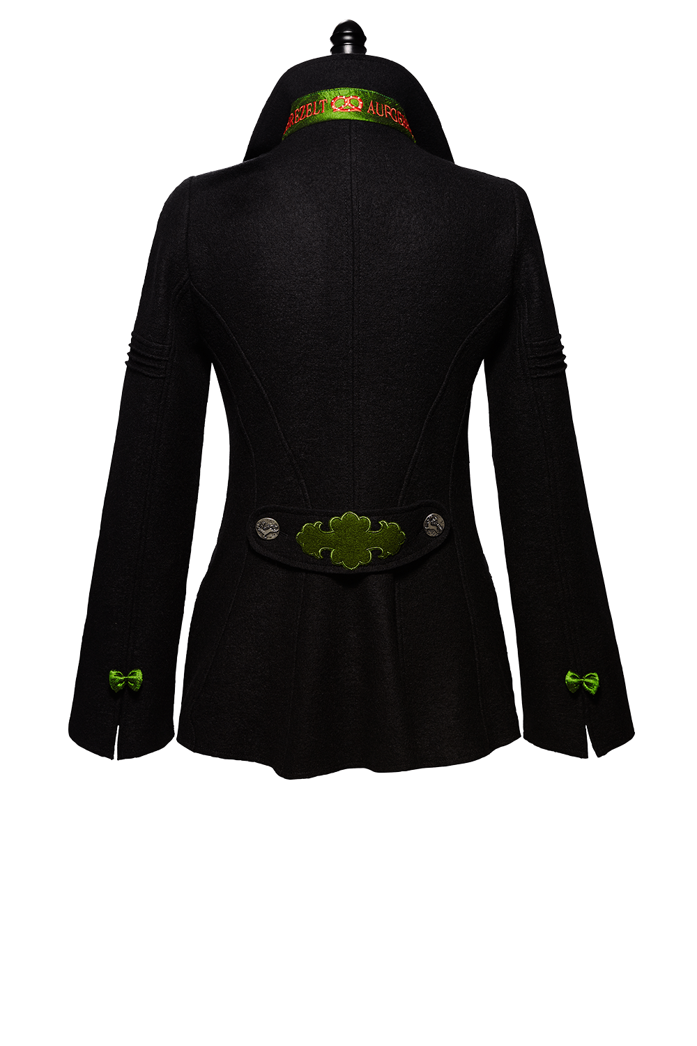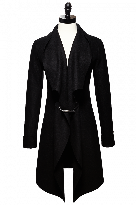 • Walk Wool long jacket unlined fitted at the waist with accent of wool appliquéd belted back pewter buttons