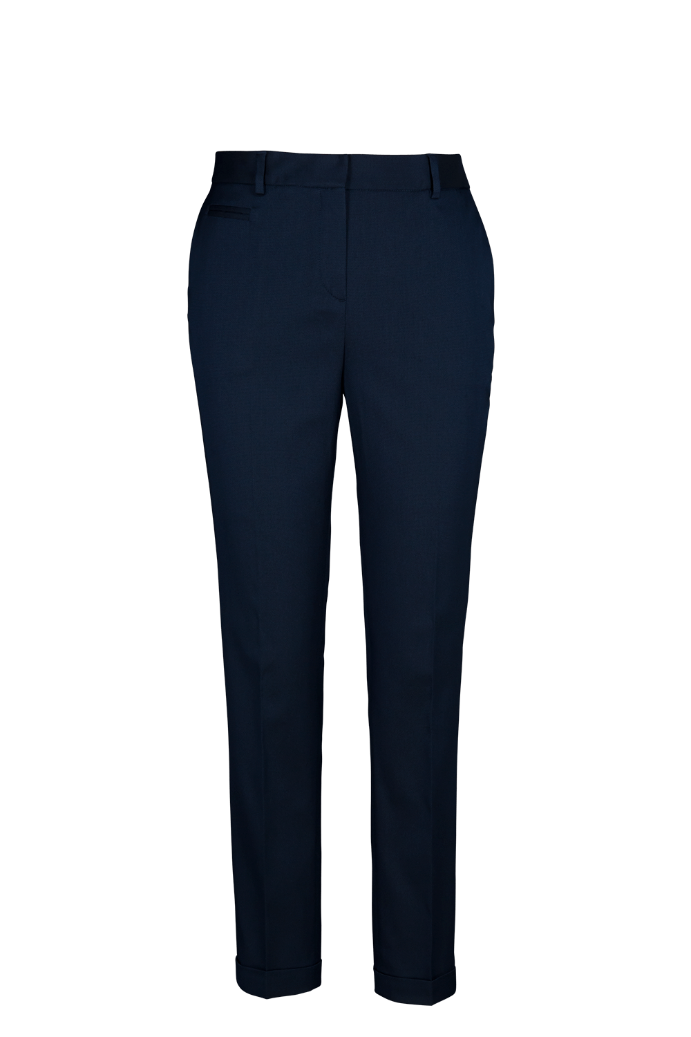 - Slim urban trouser with low rise waist, side and back pockets and tapered leg and 1.25 " cuff