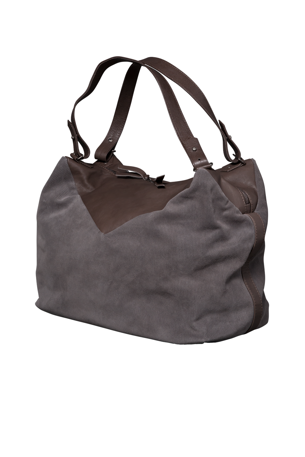 • Large double handle zippered city tote. Unconstructed soft packable handbag detailed in grain leather and corduroy printed suede. Measurements approx. 18" L X 6" D X 15" H.