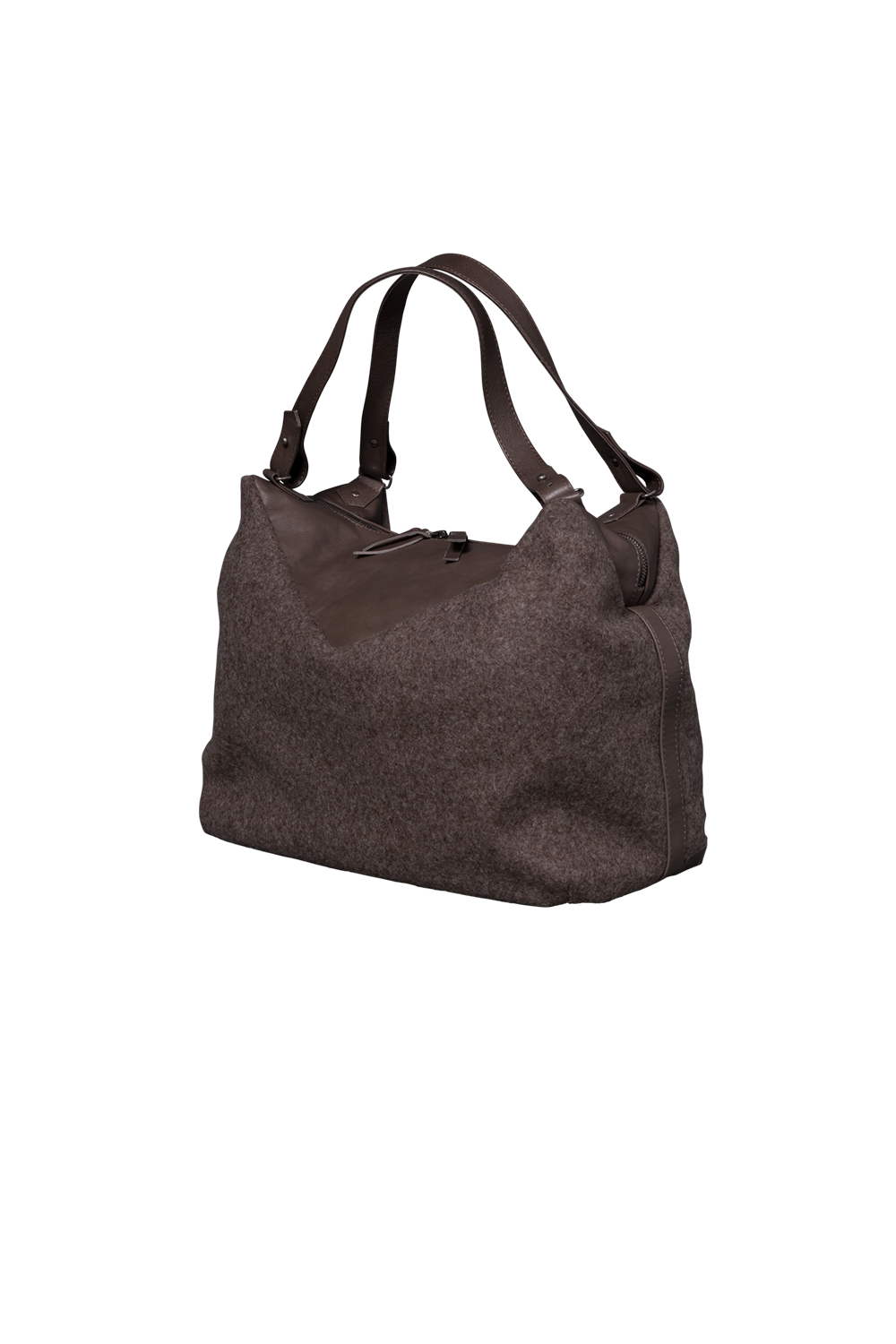 • Small double handle zippered travel bag. Unconstructed soft packable handbag detailed in grain leather and loden wool. Measurements approx. 12" L X 4" D X 10" H.