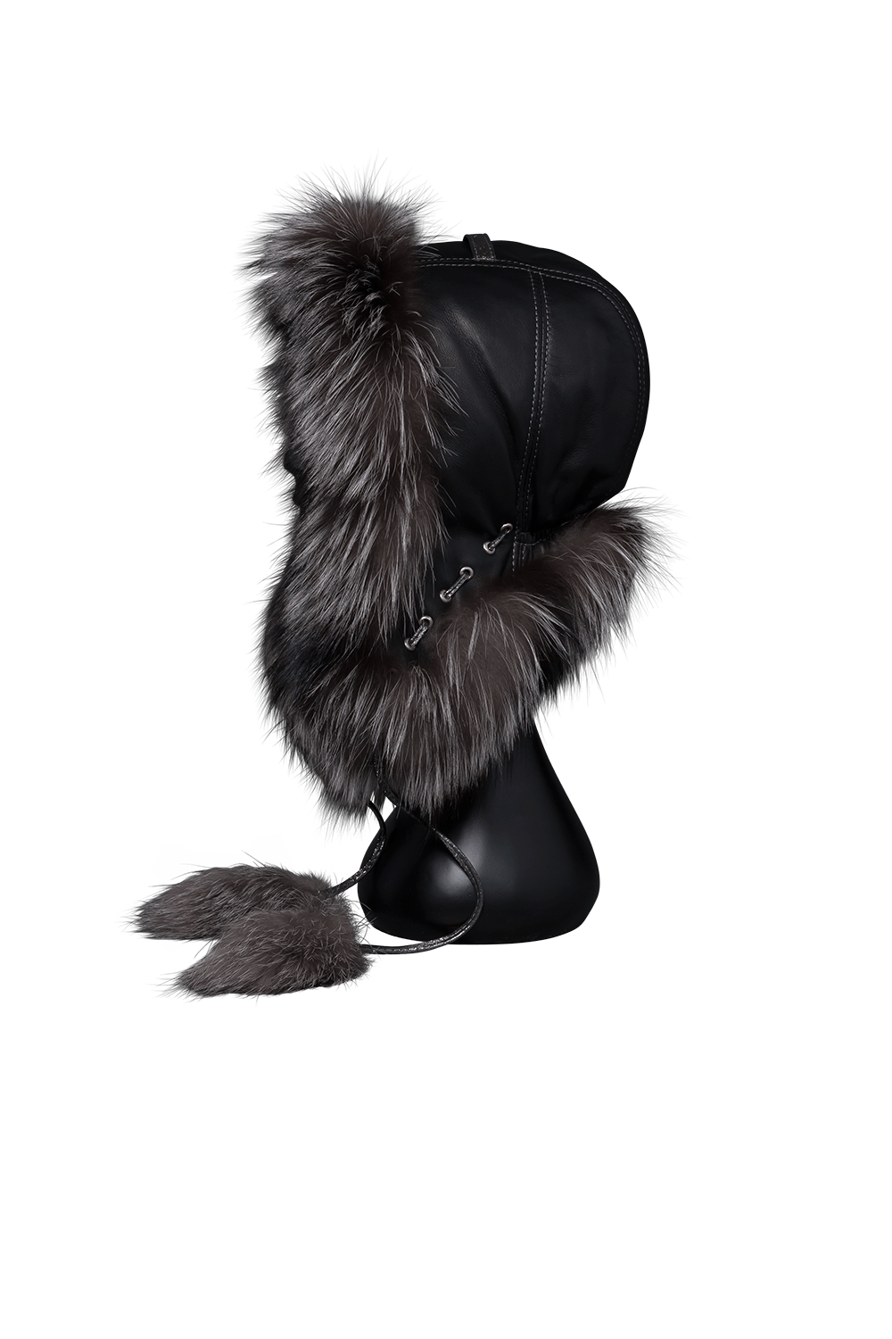 • Hooded hat with fur lining and Nappa leather outer shell with pom pom tie