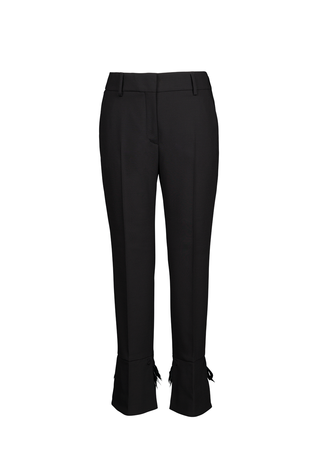 Mid-rise flat front trouser with belt loops and side pockets. Detailed with a slight flared cuff with a feather detailed trim. Trim is removable for cleaning.