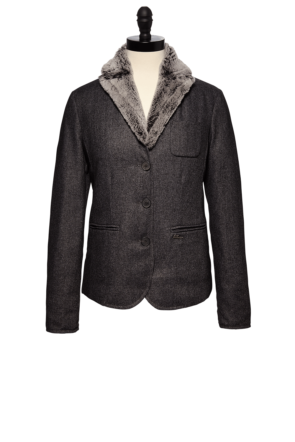 - Quilted/Wool reversible short coat with rex rabbit fur trim at collar