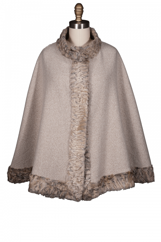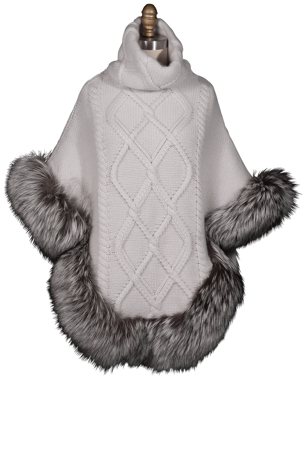 - Magnificent 10 ply cashmere knitted pullover cape with heavy fisherman cable design and trimmed in Lux Silver Fox fur.