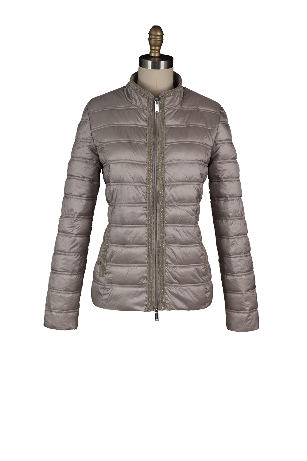 • L/S puffer liner for layering. Colar and zipper detailed of velvet ribbon and steel micro beading. Great piece to layer under your coat or wear as a light weight jacket on the weekend.