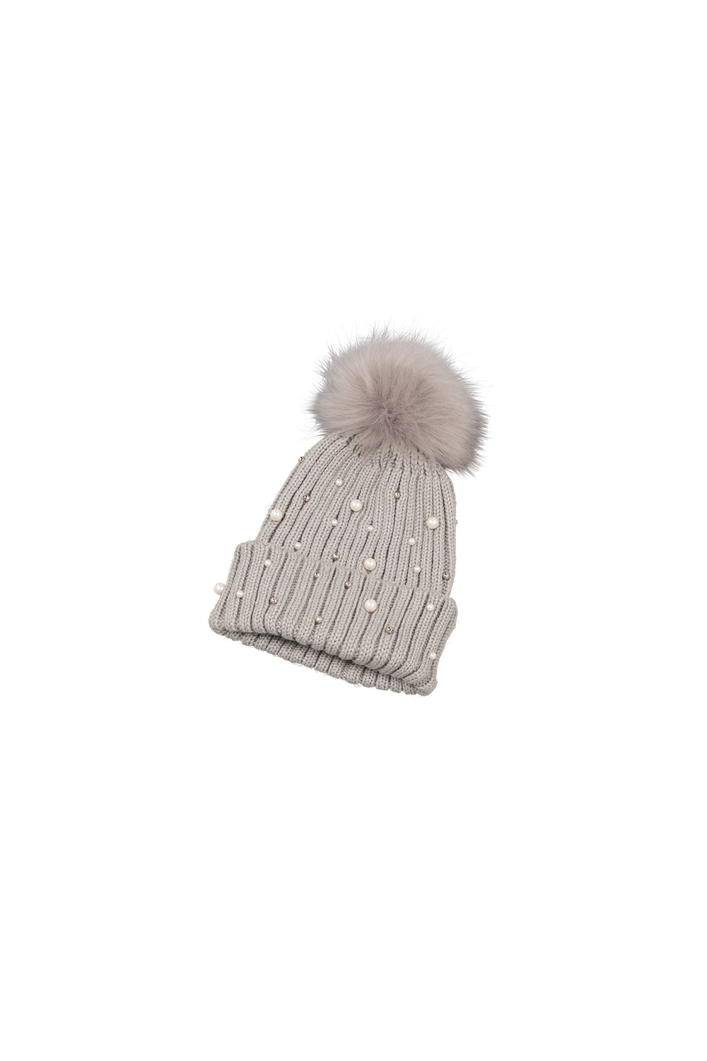 • Ribbed knitted beanie with fake fur pompom with pearl and crystal beading detail.