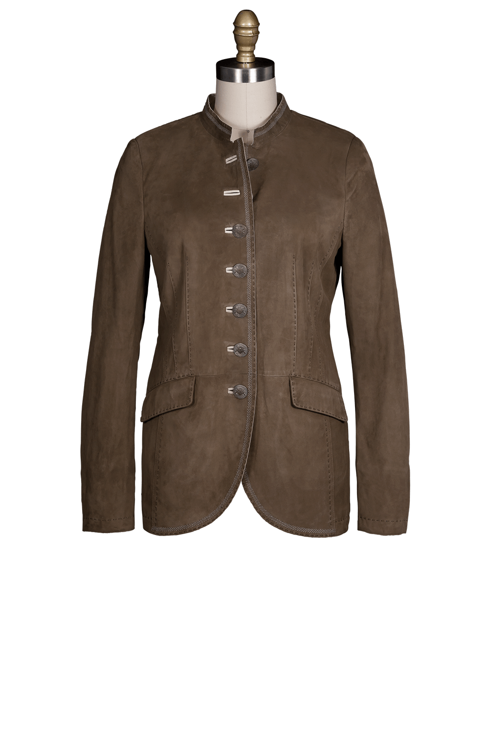 - Suede Blazer with hand stitched seams, pewter button and hand welted button holes and embroidery