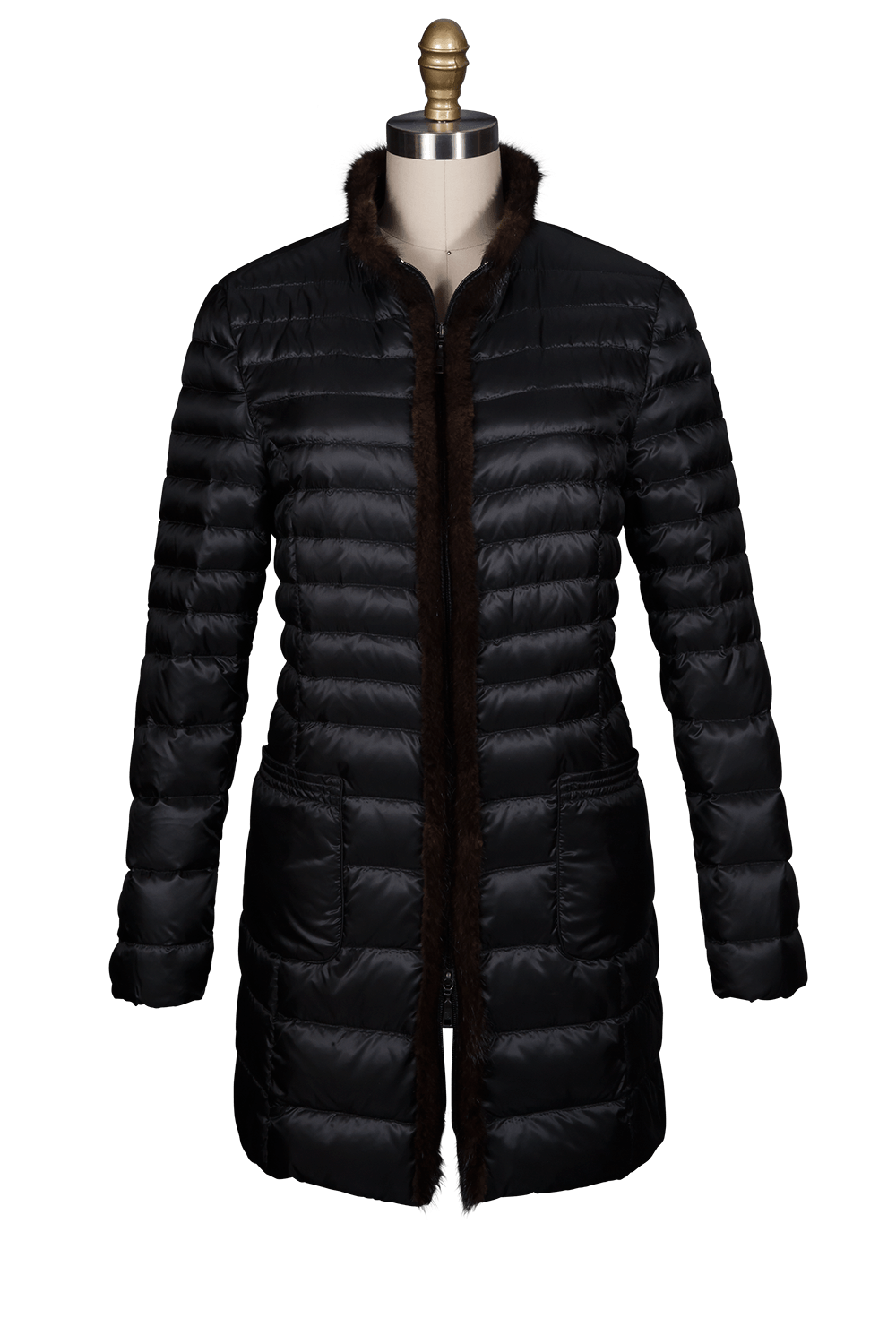 • Stroller length ultra light puffer with mink trim details