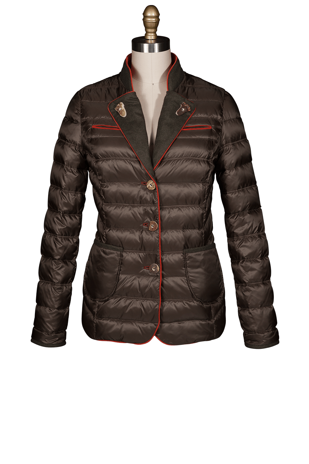 • Finger tip length Jacket with quilted ultra-light down feather fill. Accented with Loden Wool collar detail, Back belt and horn buttons