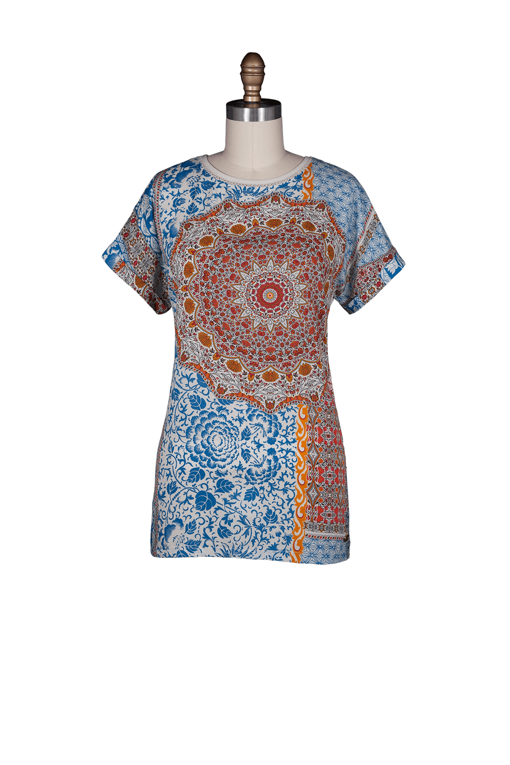 - Cuffed short sleeve long tee with marrakesh print paisley front and solid beige cotton knit back