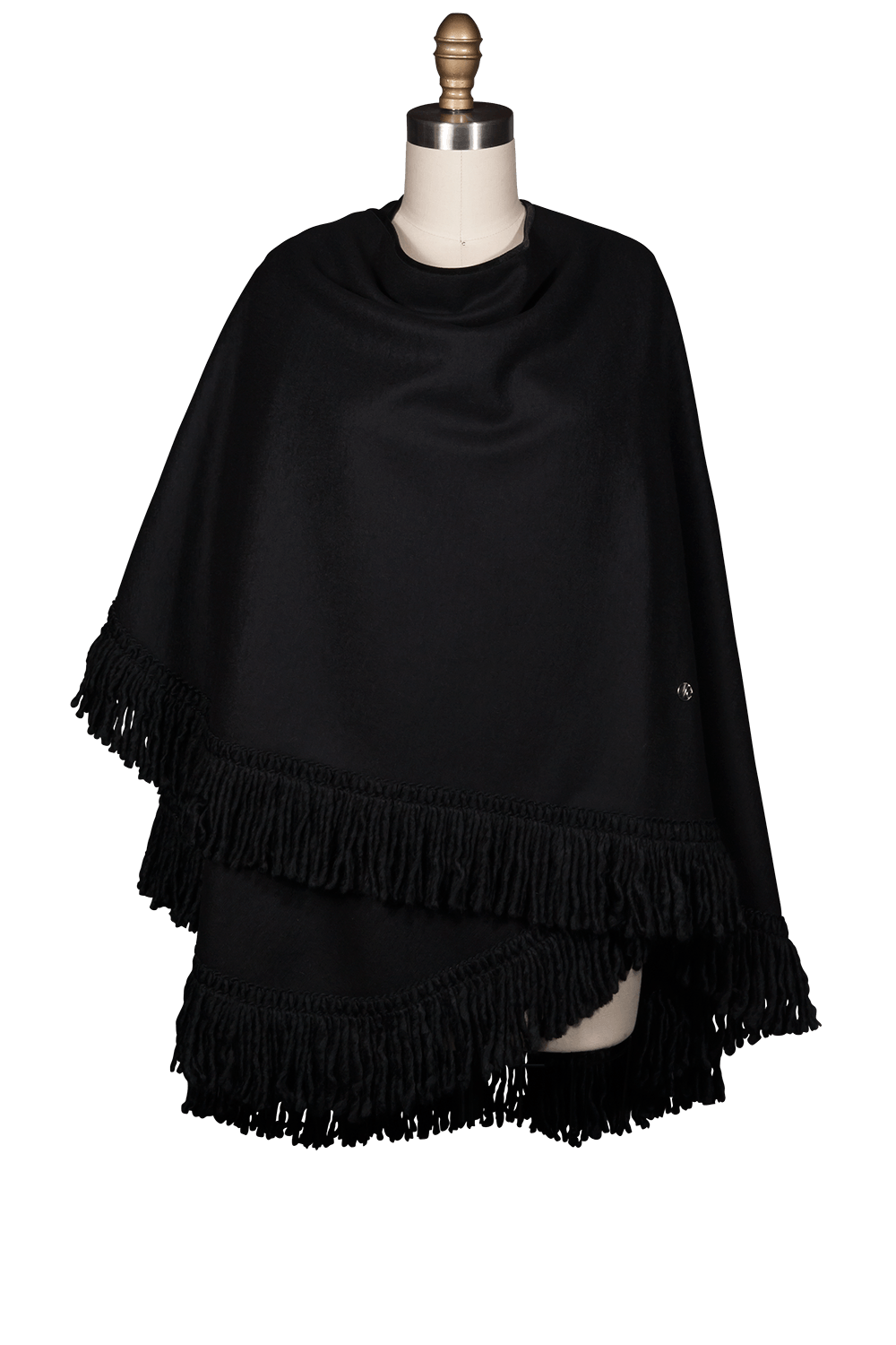 - Oversize triangle shawl made of bias cut exclusive walk wool, trimmed in long wool yarn trim.