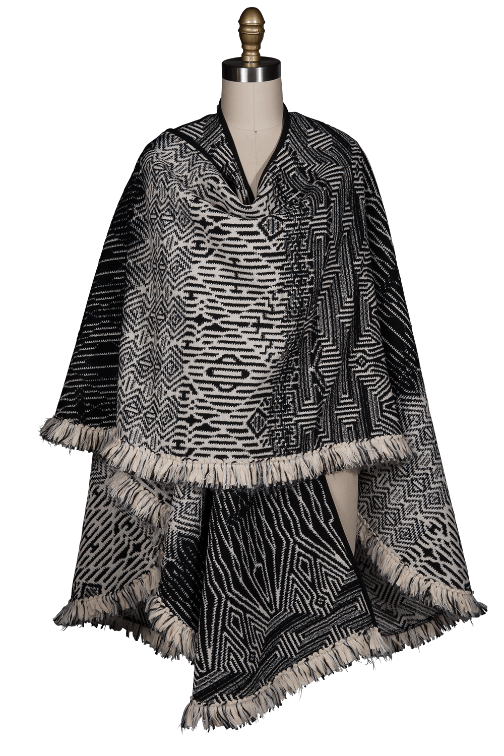 - Woven tribal print shawl with long yarn fringe trim