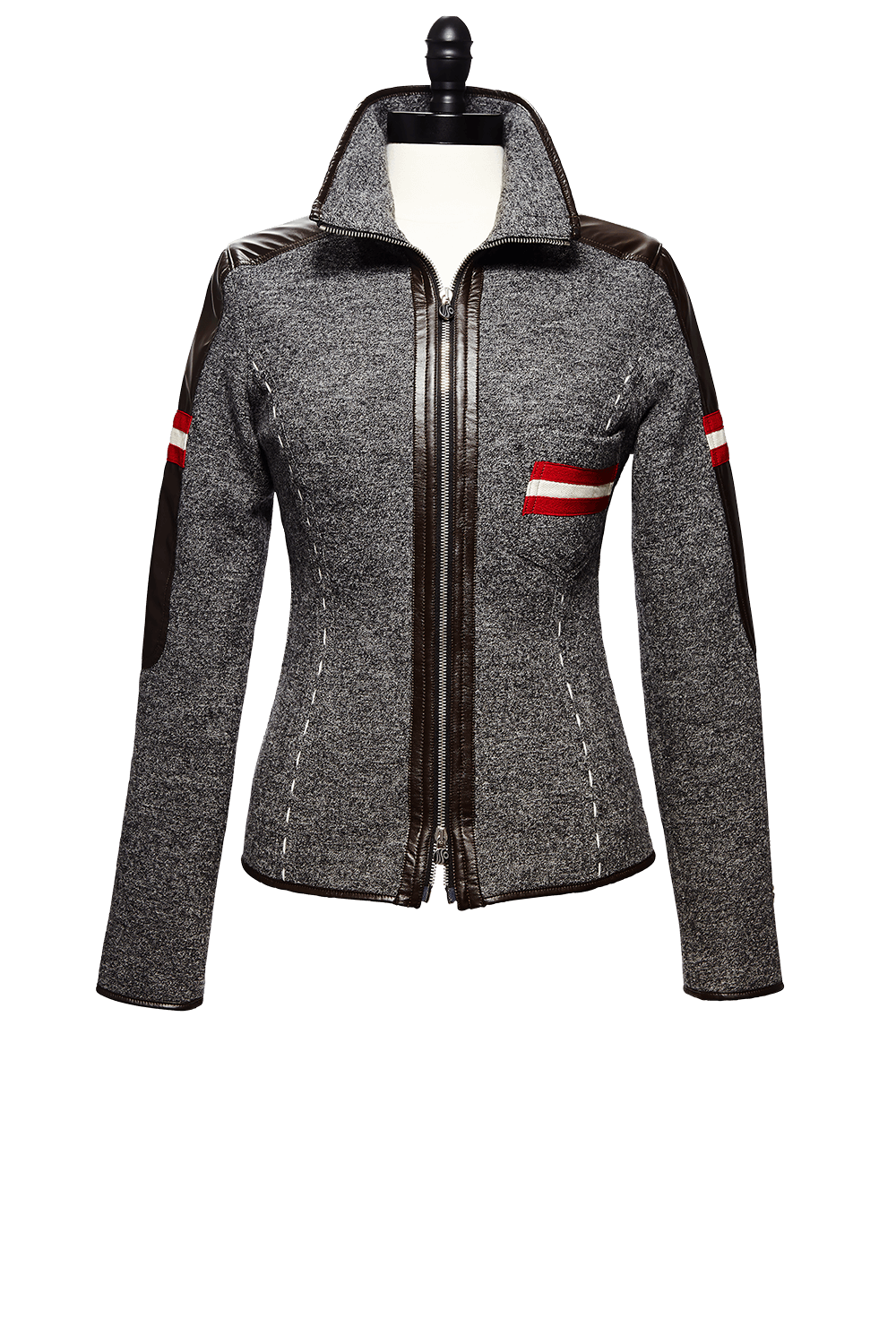 - Zipper Jacket in Heavy Heather Black wool with accent trim in tech leather