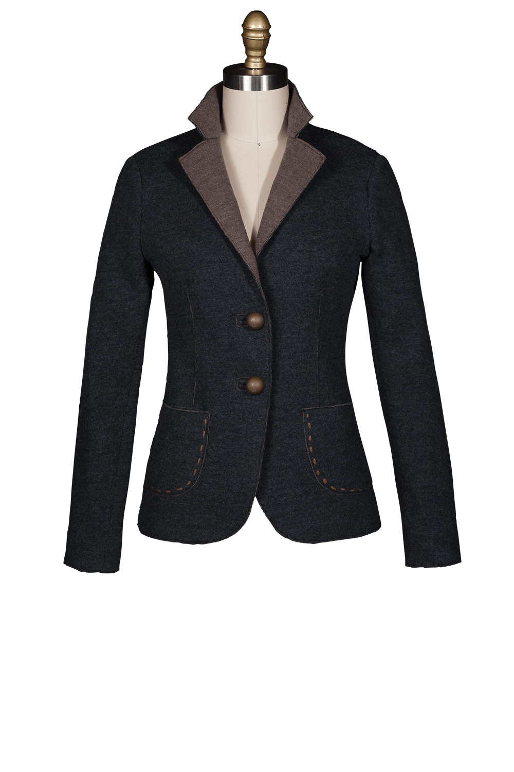 - Double face wool knit jersey classic style with hand pick stitched seams. This is a wonderful travel piece, can be worn dark grey or dark brown and has the ease of a sweater.