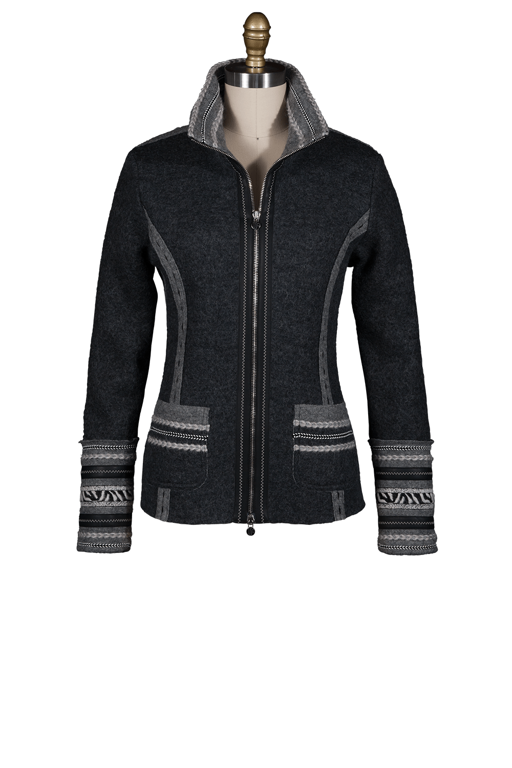 - Weekend zipper front blazer with handmade Austrian embroidered trim detail on the cuff and zipper plaque. Hand pick stitched seam detailing.