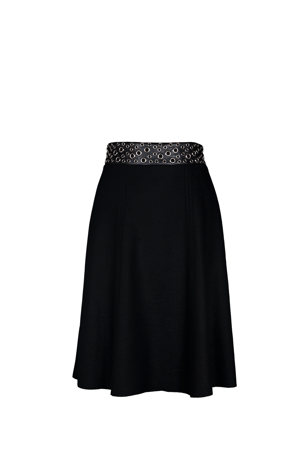 - Long A-line skirt made in bias cut wool with detailed back full length zipper and grommet detail at waist