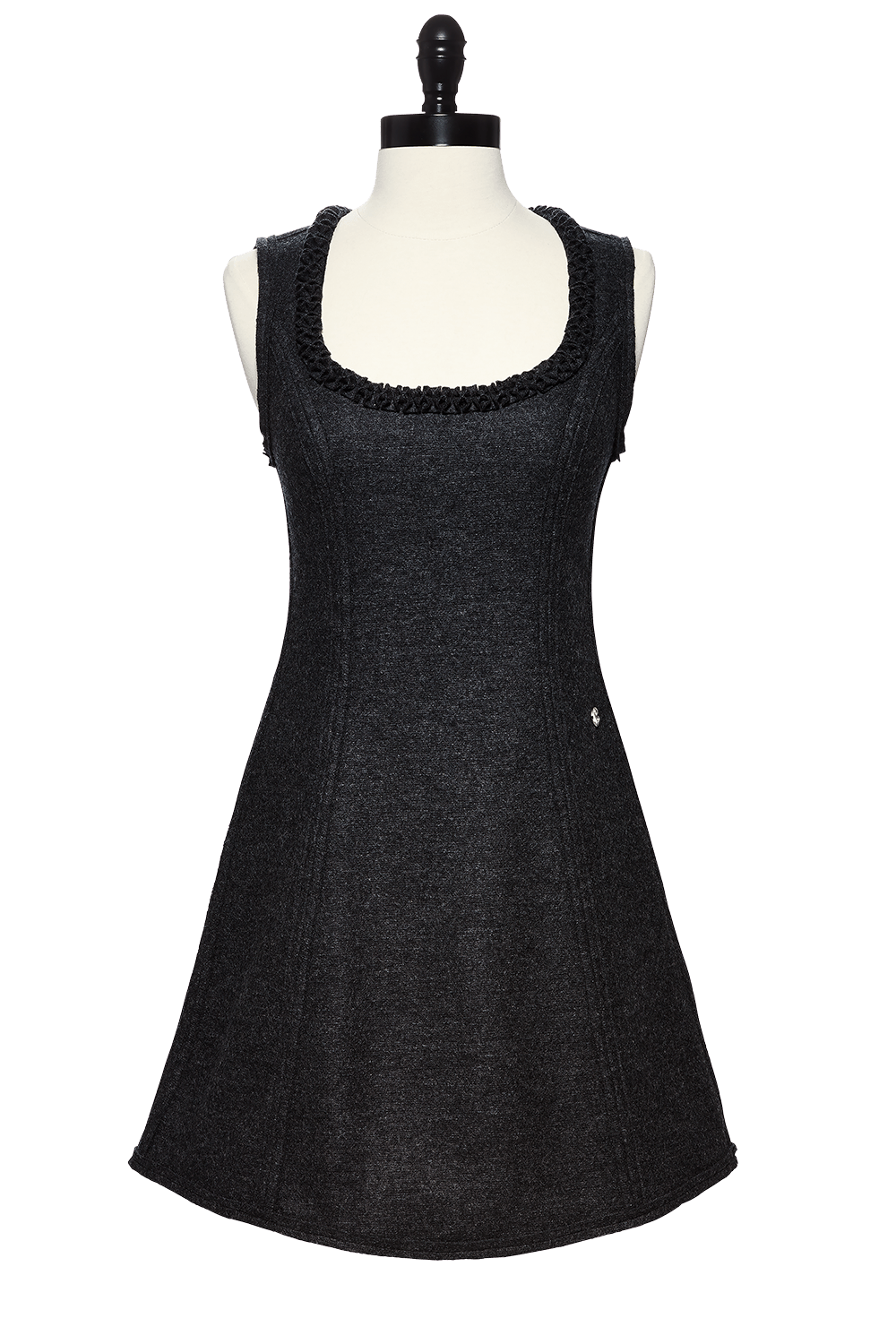 • Audrey Dress - sleeveless fitted bodice with wool ribbon trim at neck and arms