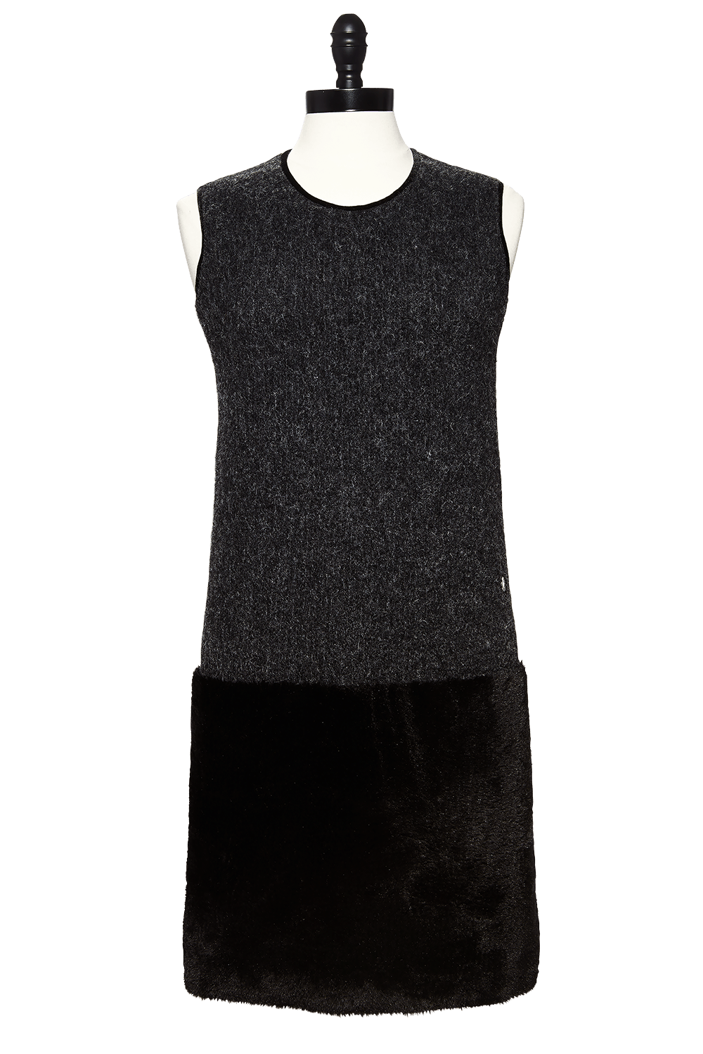 - Straight sheath with faux wool fur hem and swarovski crystal zipper detail closure