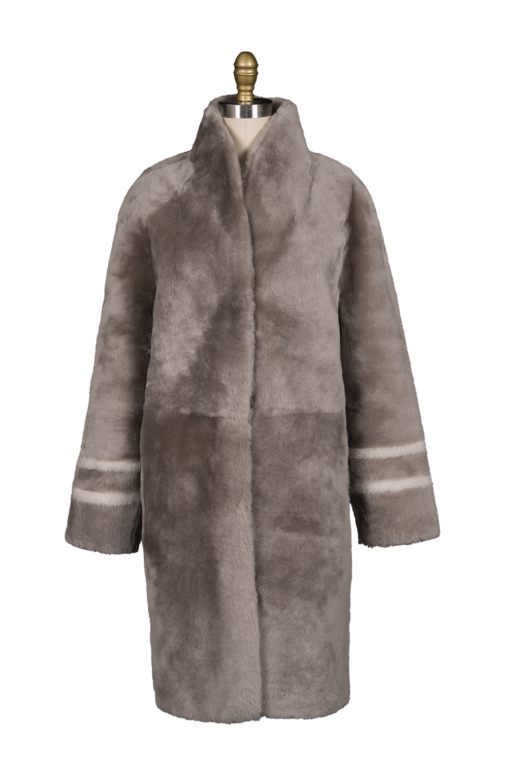 Full length reversible shearling top coat with shawl collar and belted back. Detailed in contrasting shearling trim, patch pockets and side slits with snap closure. Great stroller and weekend coat. This item is available for special order in sizes 4-16. Please allow approximately 4 weeks delivery.