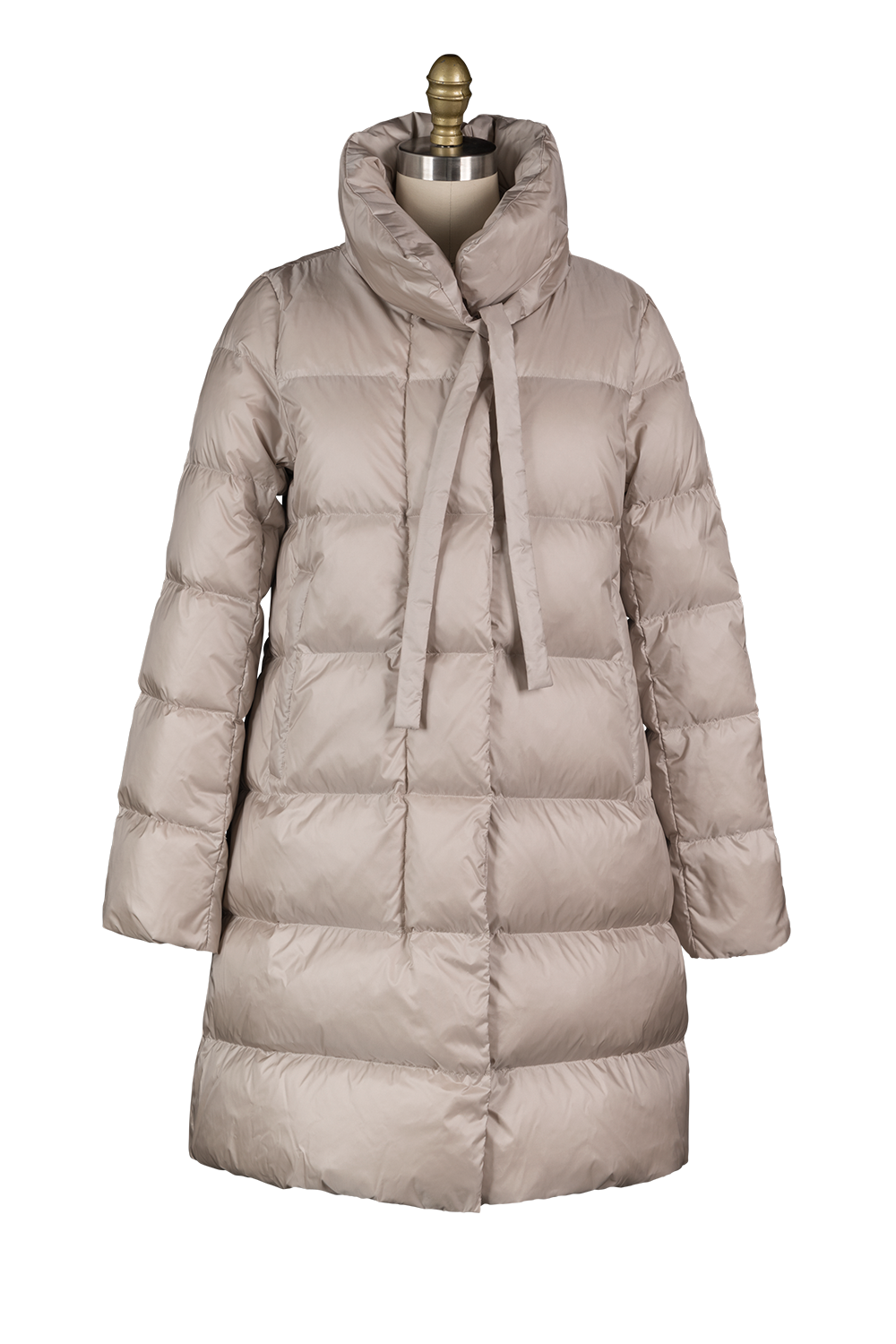• Long knee length A-line coat. Detailed with self tie and stand up collar. The perfect in-town coat for walking.