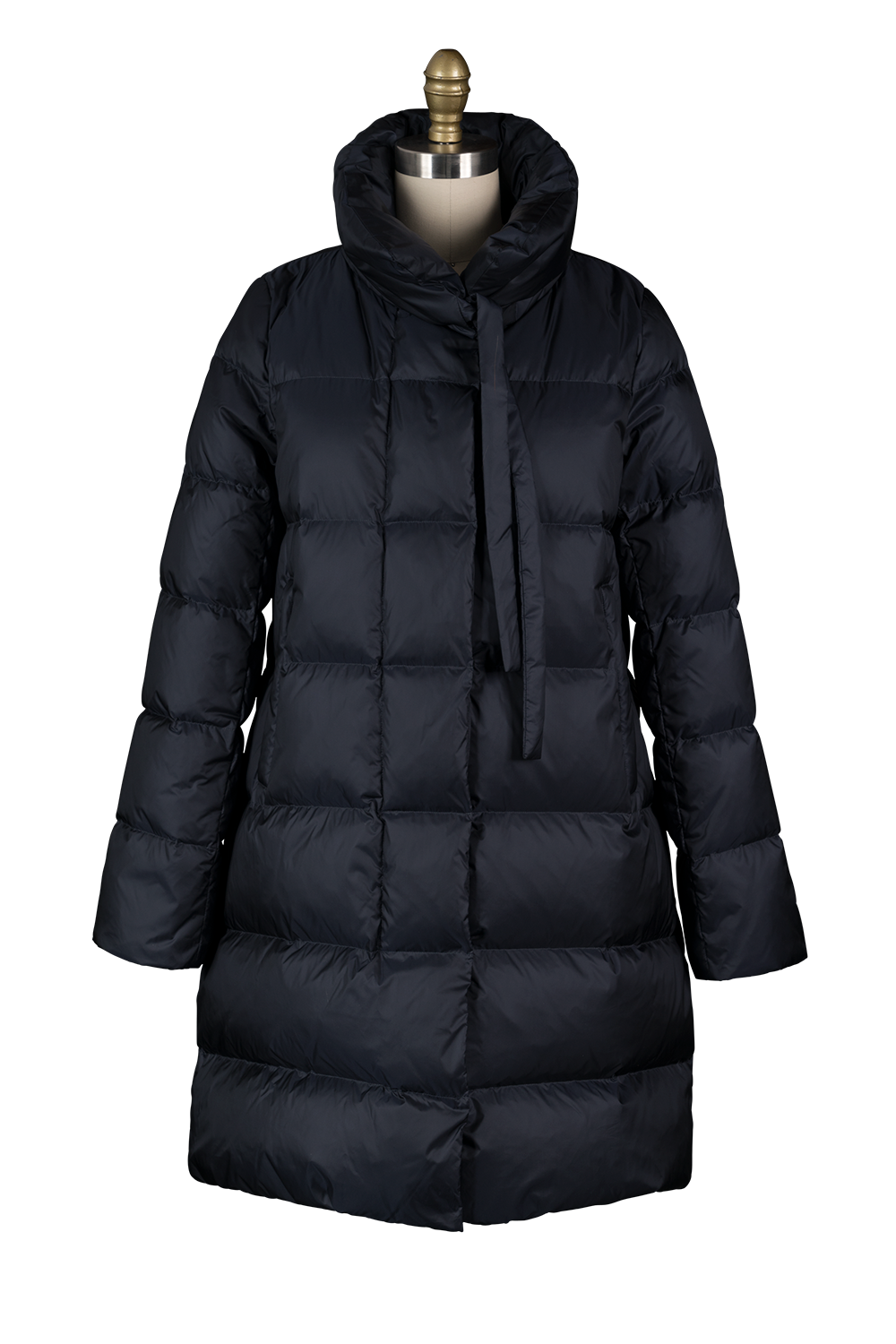 • Long knee length A-line coat. Detailed with self tie and stand up collar. The perfect in-town coat for walking.