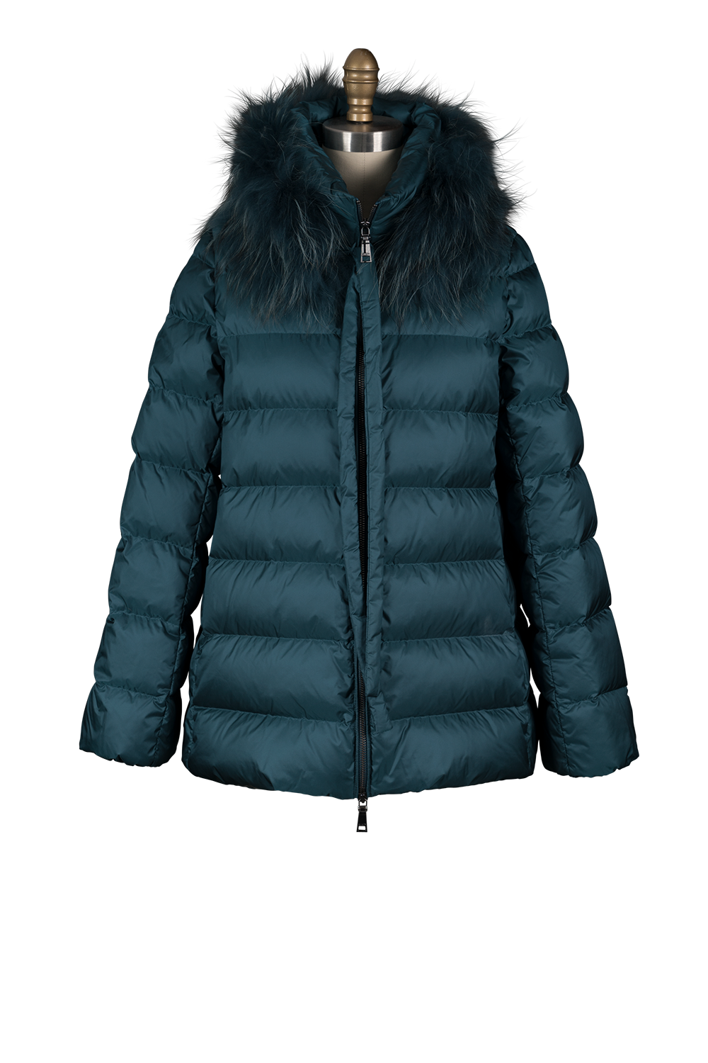 • Short down coat with front zipper and stand up collar. Detailed with removable matching fox fur collar.