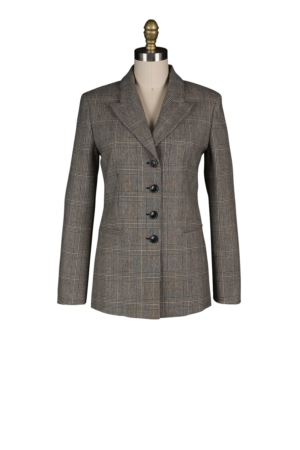 Single breasted peaked lapel long jacket. Detailed with front welted pocket and belted back in a glen plaid mens' suiting fabric .