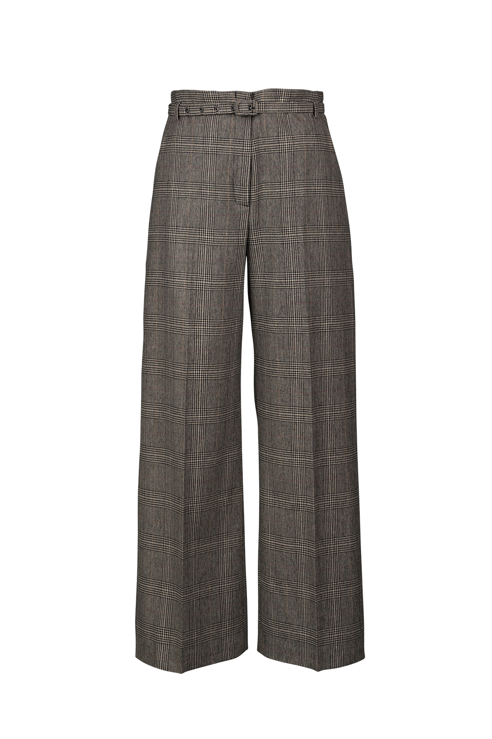 High waisted wide cropped trouser. Detailed in a tailored glen plaid men's suiting fabric with skinny self belt.