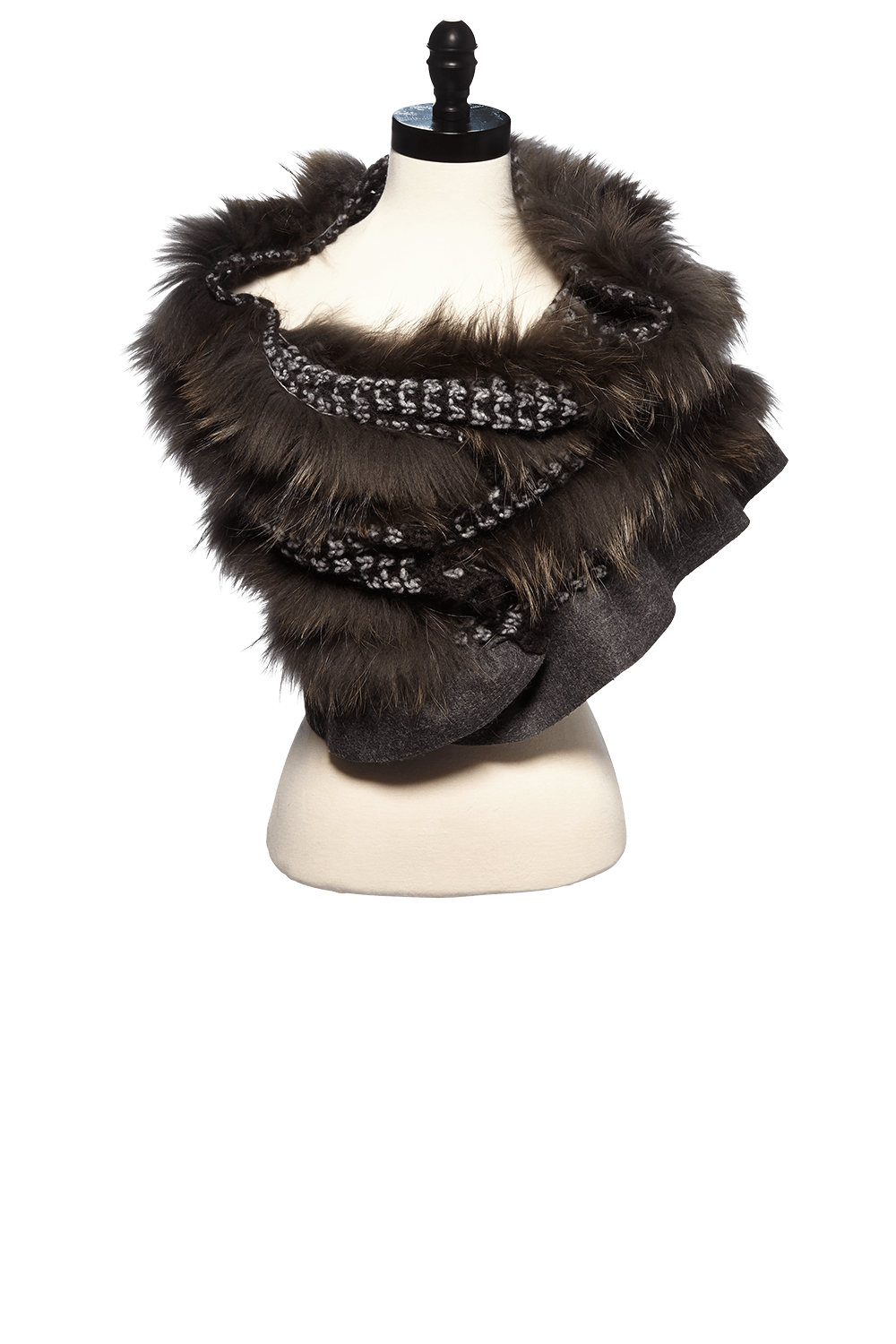 - Wrap scarf with knitted ribbing and fox fur inset with wool fabric trim