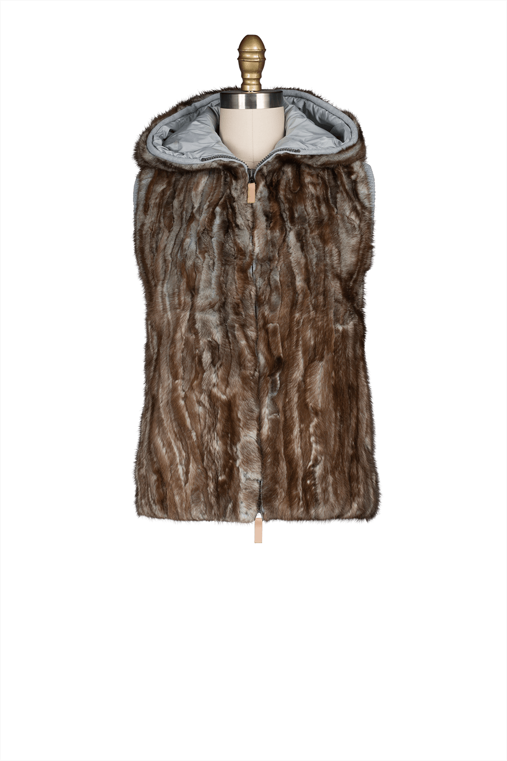 Hooded mink fur and cashmere silk blended knitted vest. Detailed with knitted hood and back with mink front. Pair this with a wonderful handmade sweater, cozy wide whale corduroy trousers for a weekend look or strolling the city.