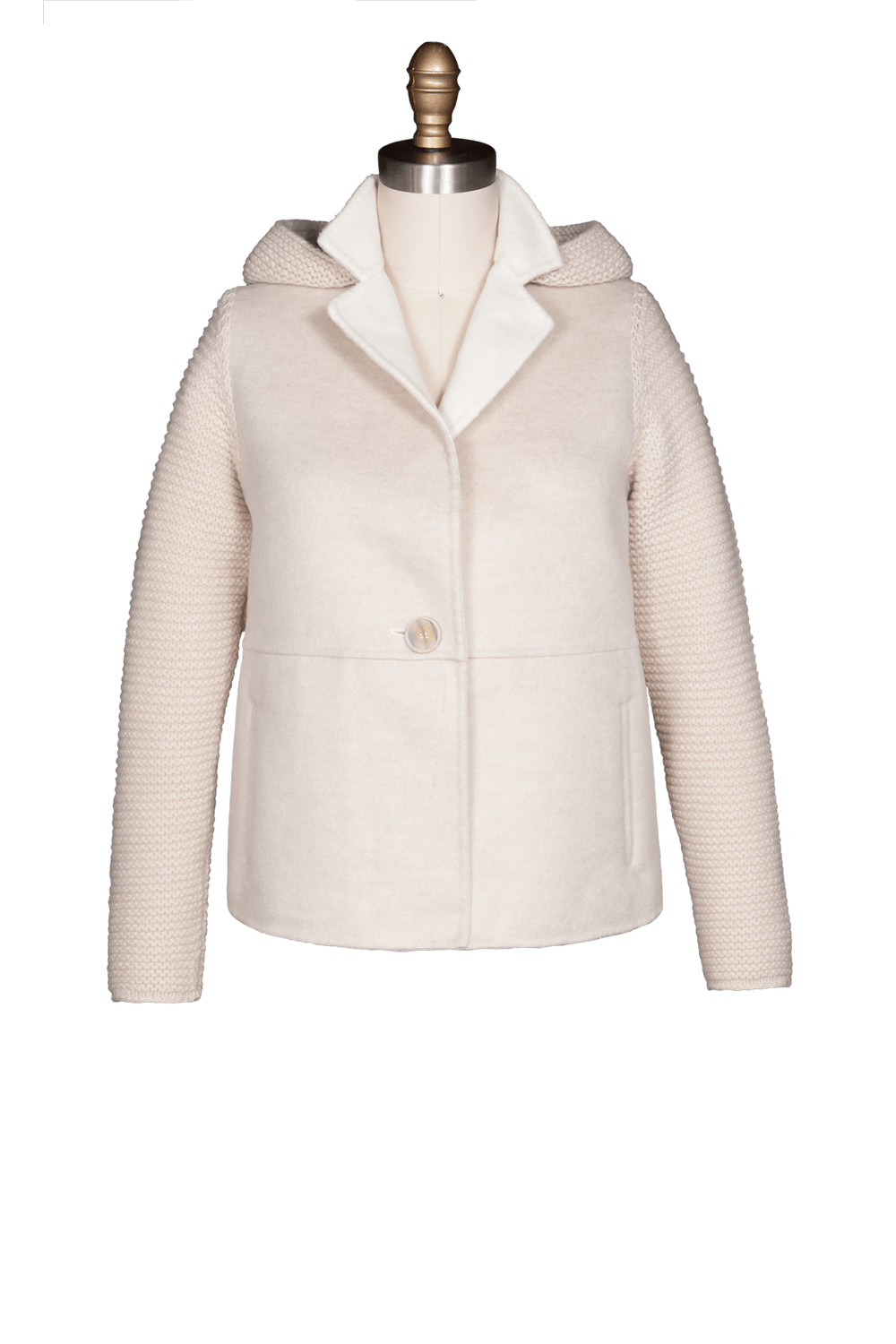 • Hooded swing jacket with double-face cashmere fabric and cashmere blend knitted sleeves, back and hood.