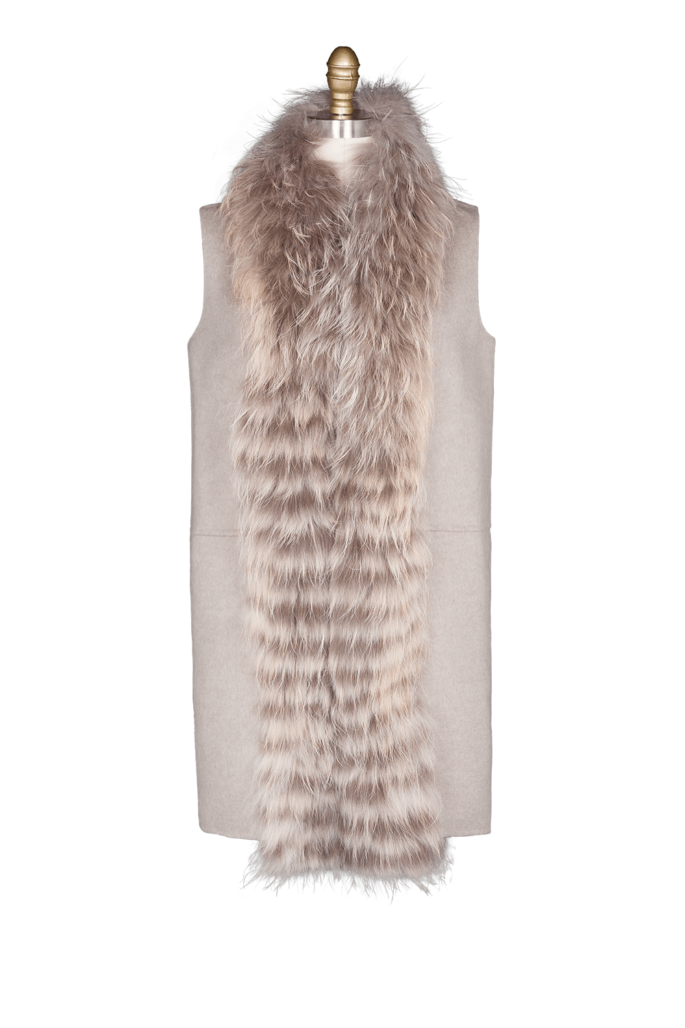 • Sleeveless 3/4 stroller vest in double-face fabric and Finn Raccoon trim on collar and front lapel and knitted back.