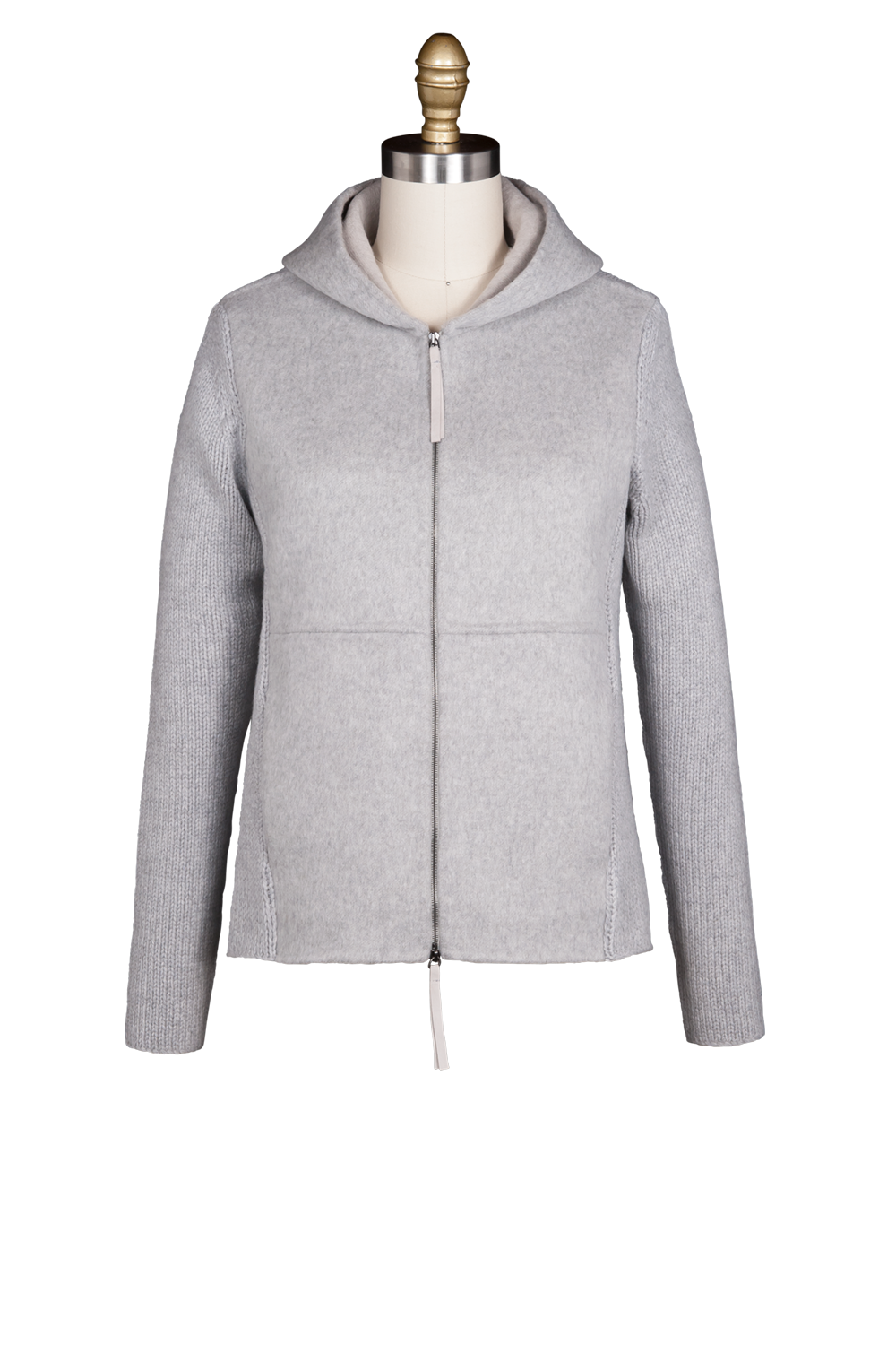 Hooded jacket with double-face cashmere fabric and cashmere blend knitted sleeves, back and hood.