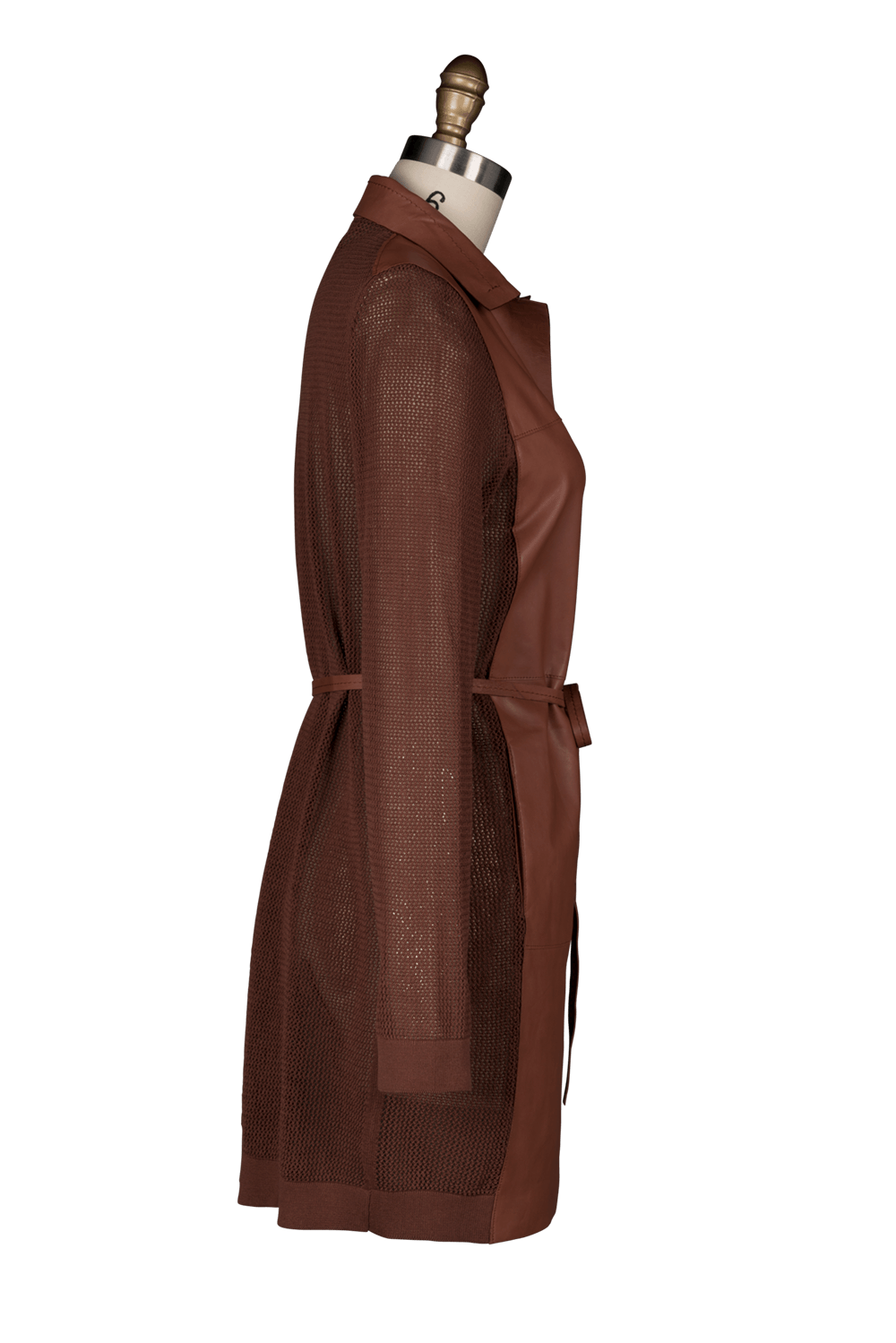 L/S Summer coat sweater with open fishnet woven back and sleeves accented with soft nappa leather front, snap closure and leather sash belt. Loose fitting in body.