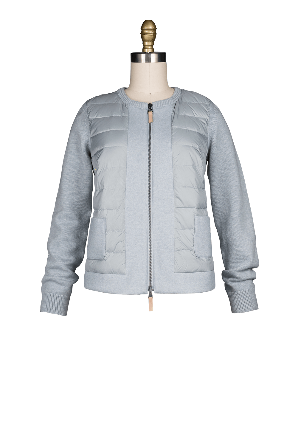 Cropped jacket with down filled front placket and small patch pocket with knit sleeves and back,