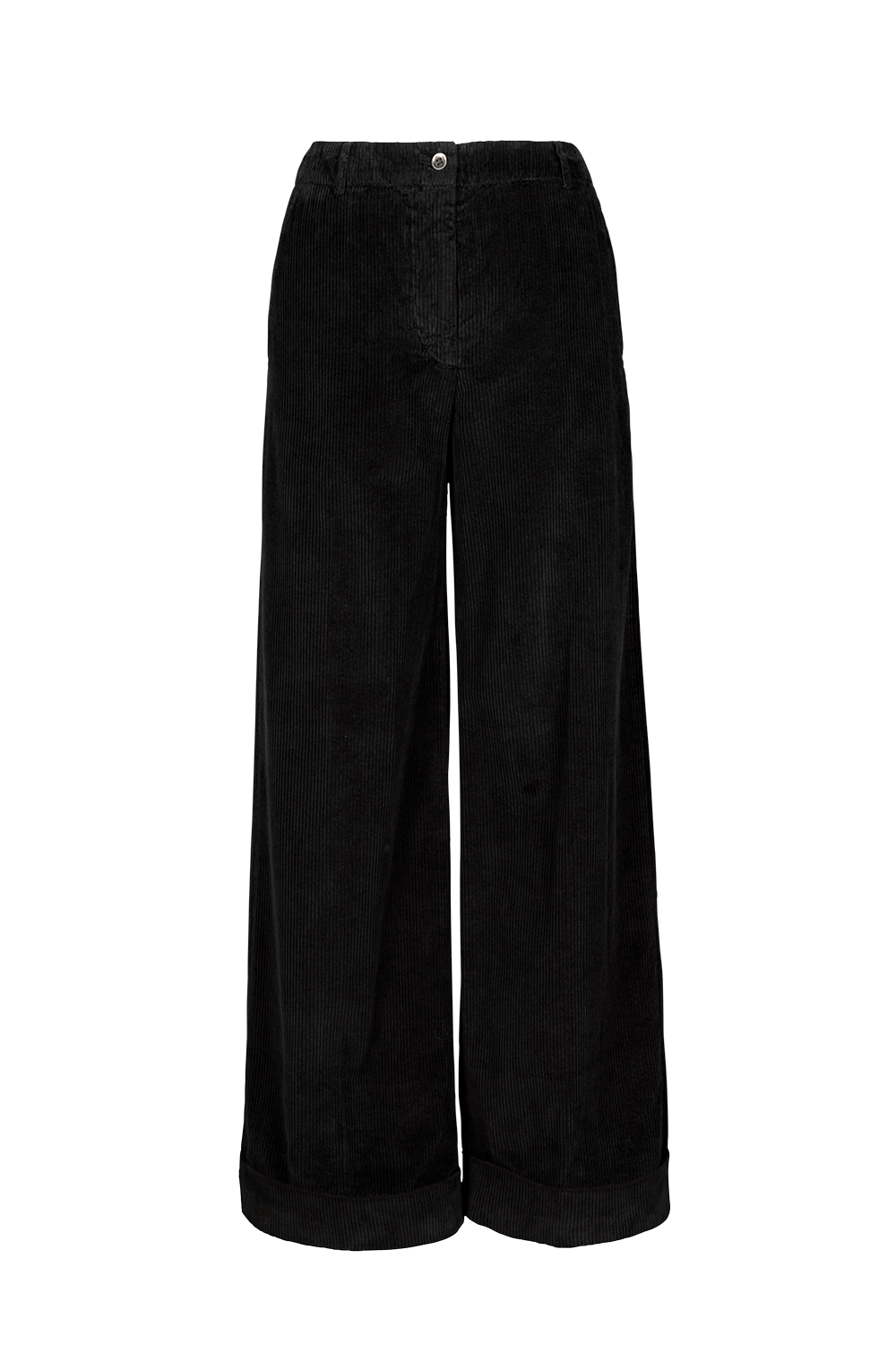 • Flat front high waisted 2" cuffed pant. Detailed with side pockets and wide legged.
