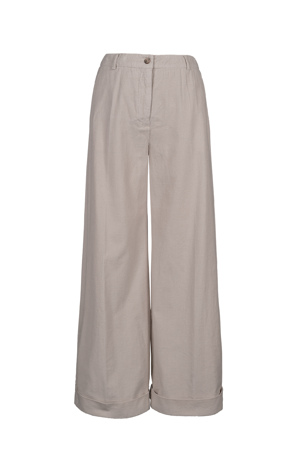 • Flat front high waisted 2" cuffed pant. Detailed with side pockets and wide legged.