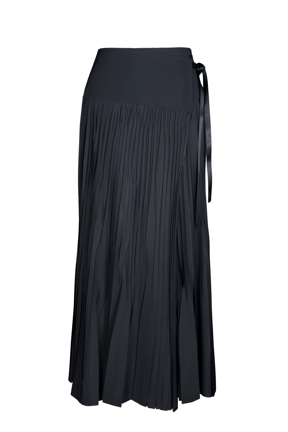 Long micro-pleated wrap style skirt with fitted to hip with side zipper.