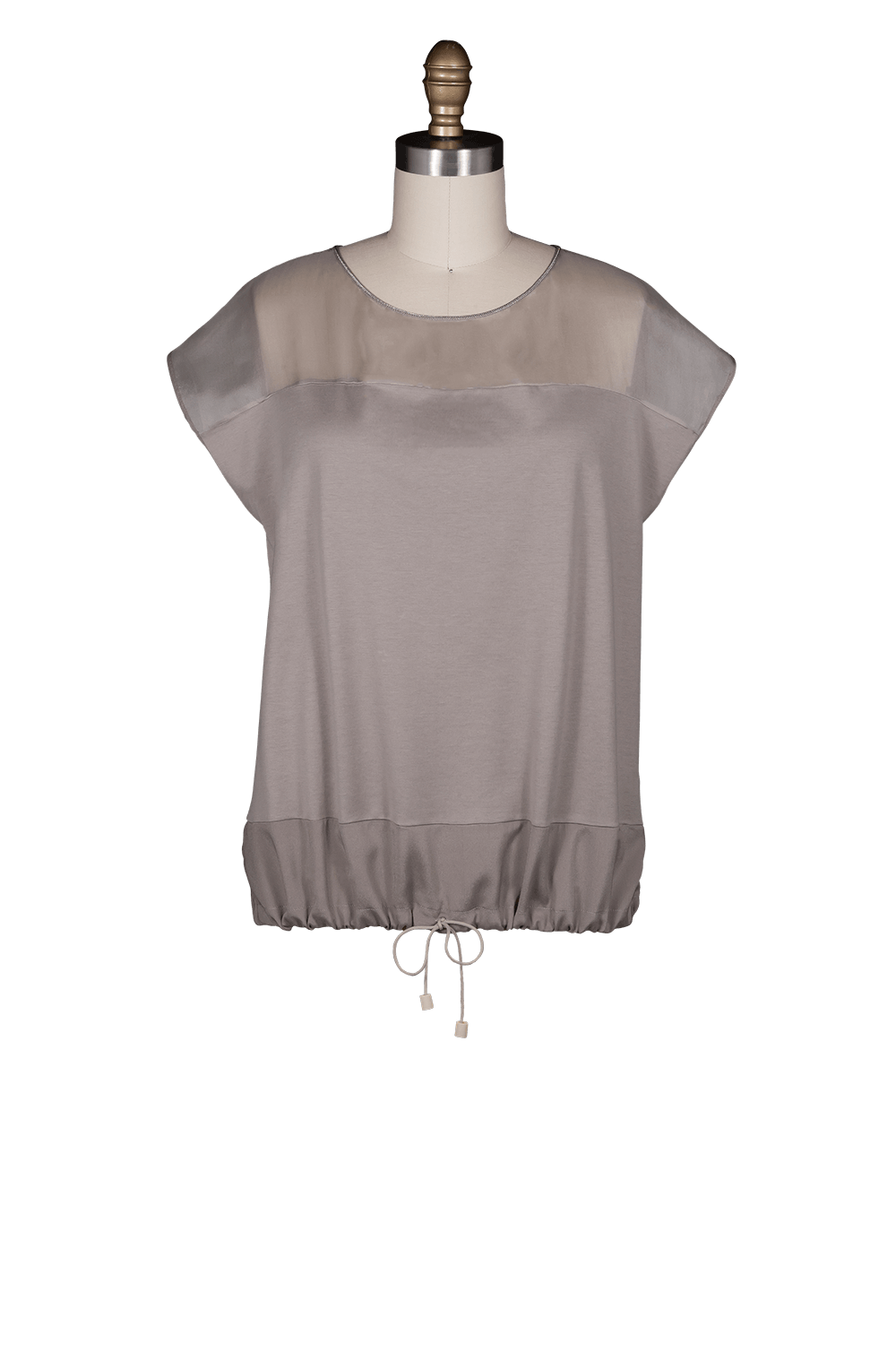 • Short Sleeve drawstring knit jersey top with satin silk and silk chiffon accents. Detailing at neck with silver chain trim