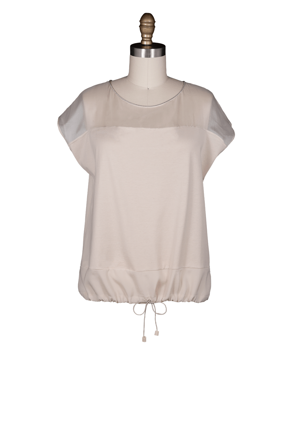 • Short Sleeve drawstring knit jersey top with satin silk and silk chiffon accents. Detailing at neck with silver chain trim