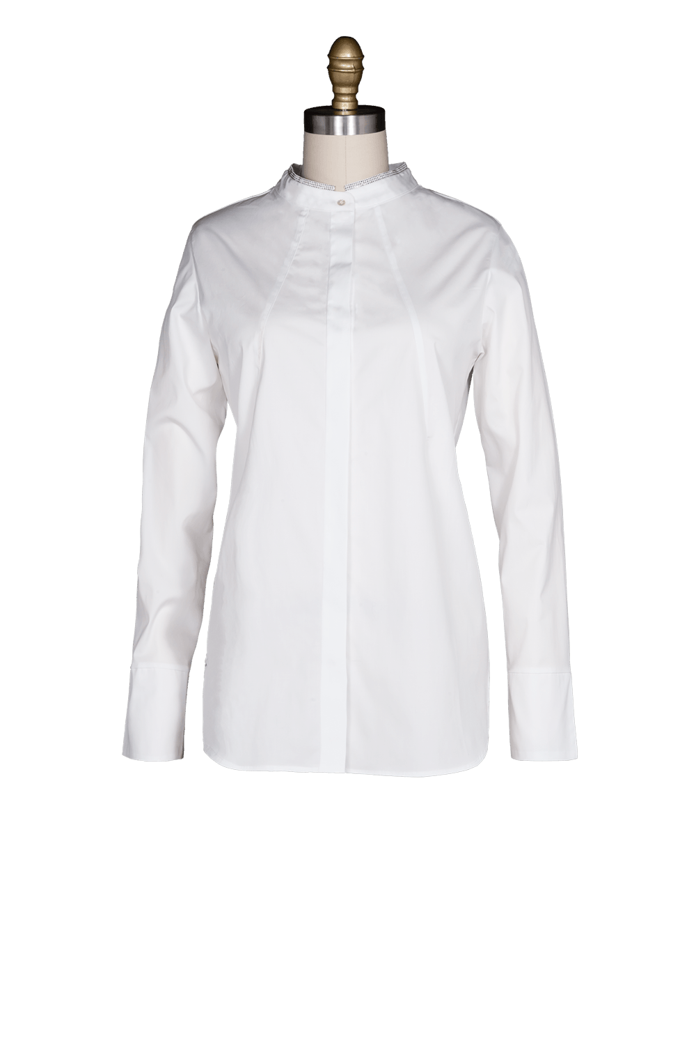 - Modern collarless blouse with micro stud detailing trim on neckline. Slightly fitted with darted front and back.
