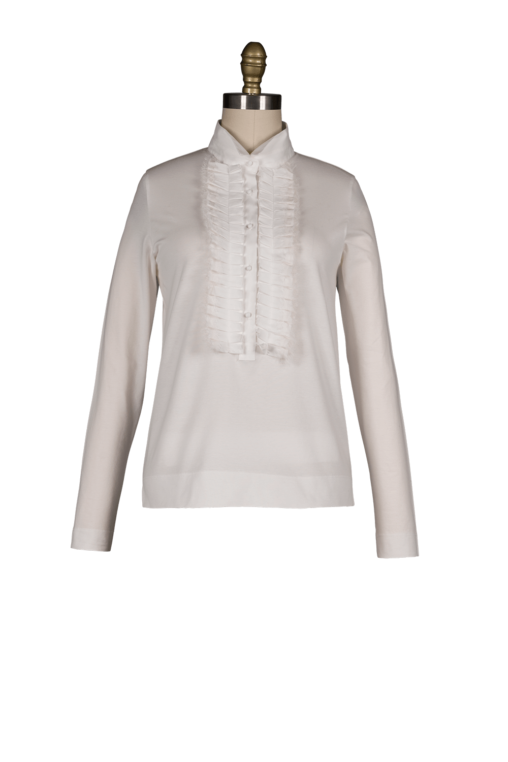 Long Sleeve cotton knit 5 button polo with embroidered ruffle bib front.