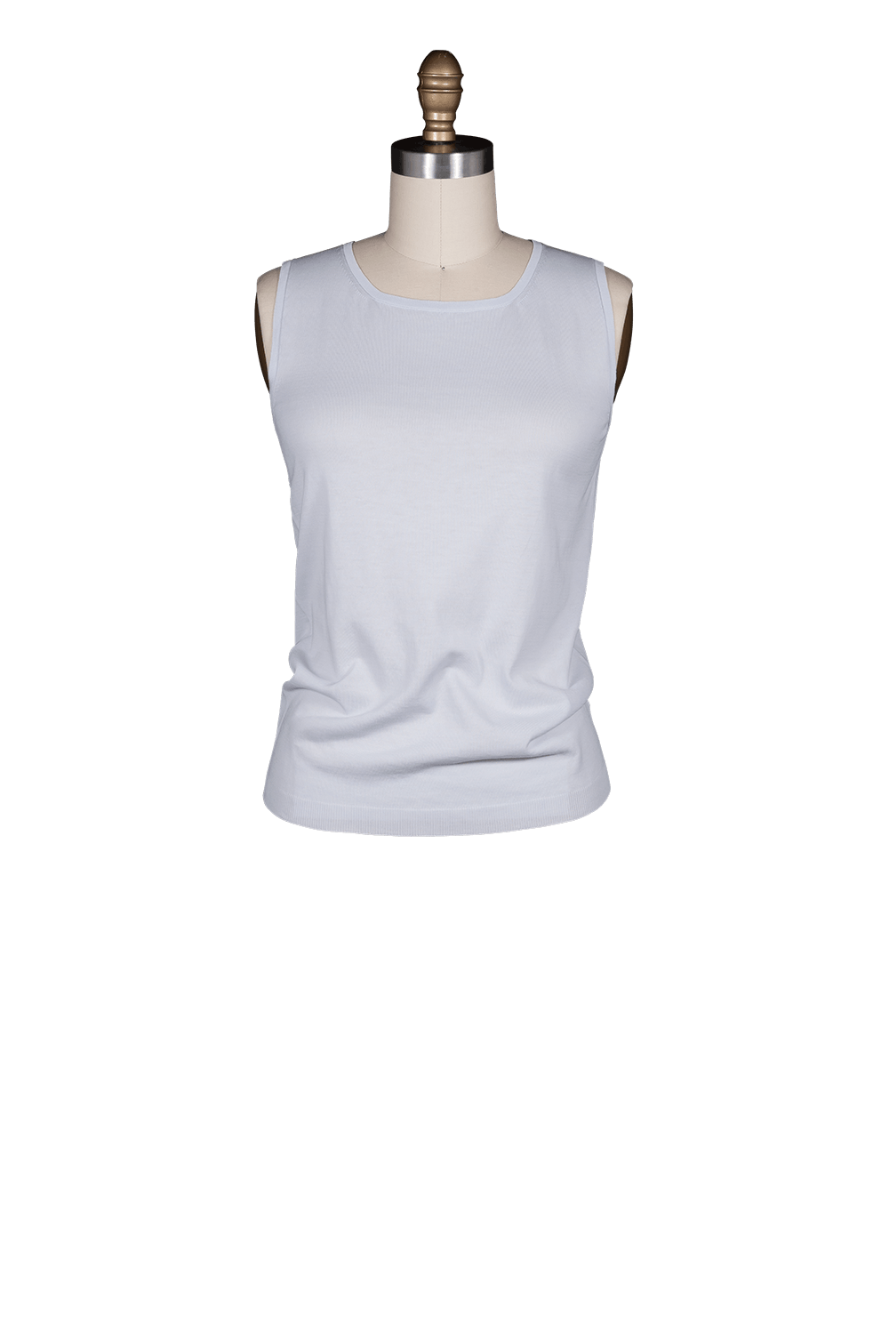 • Fine gauge prima cotton knit sleeveless shell with rib banded waist and slight square neckline.
