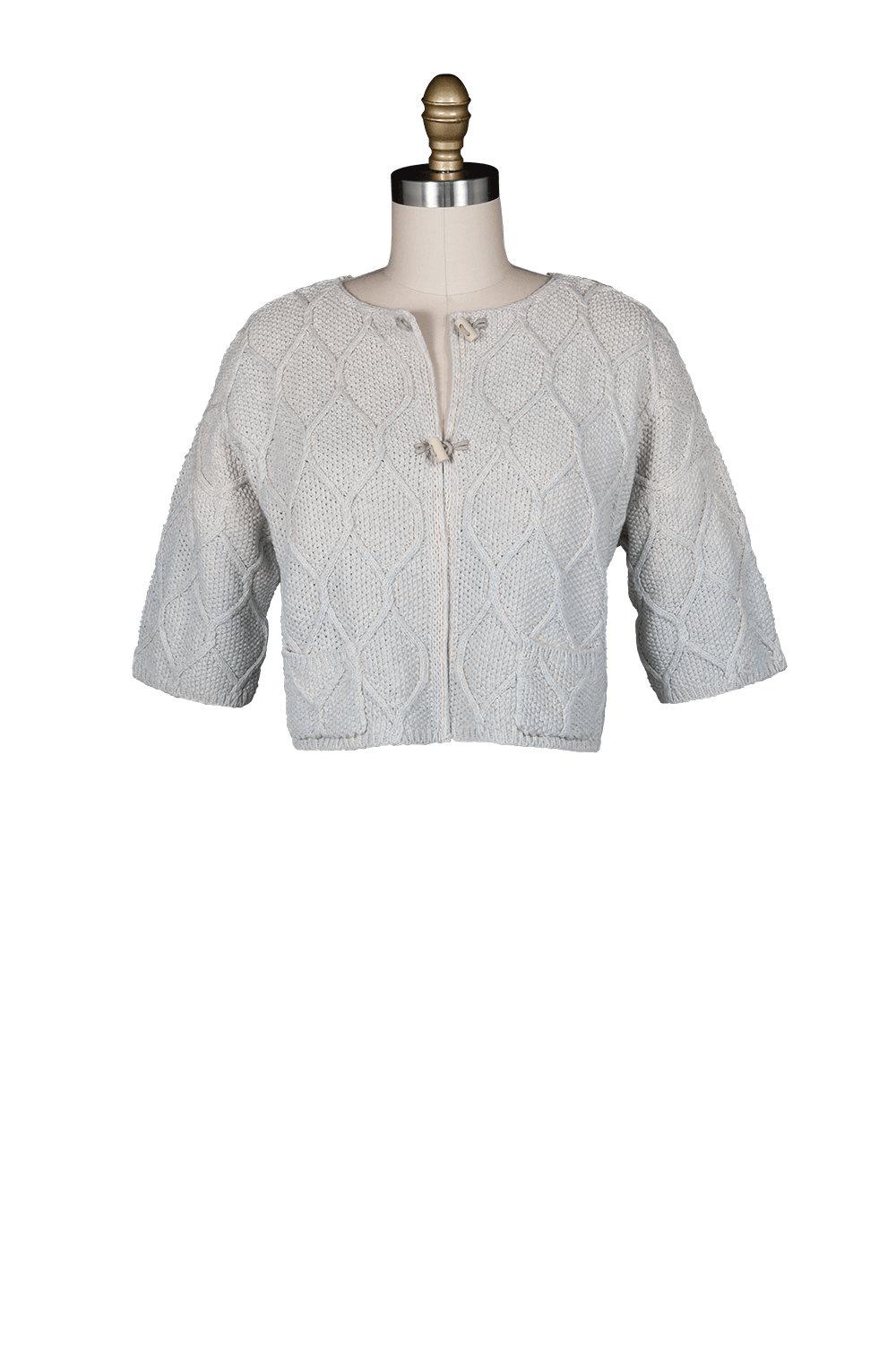- Cropped fisherman cable sweater with 3/4 sleeves. Heavy gauge yarn dyed faded coloration.