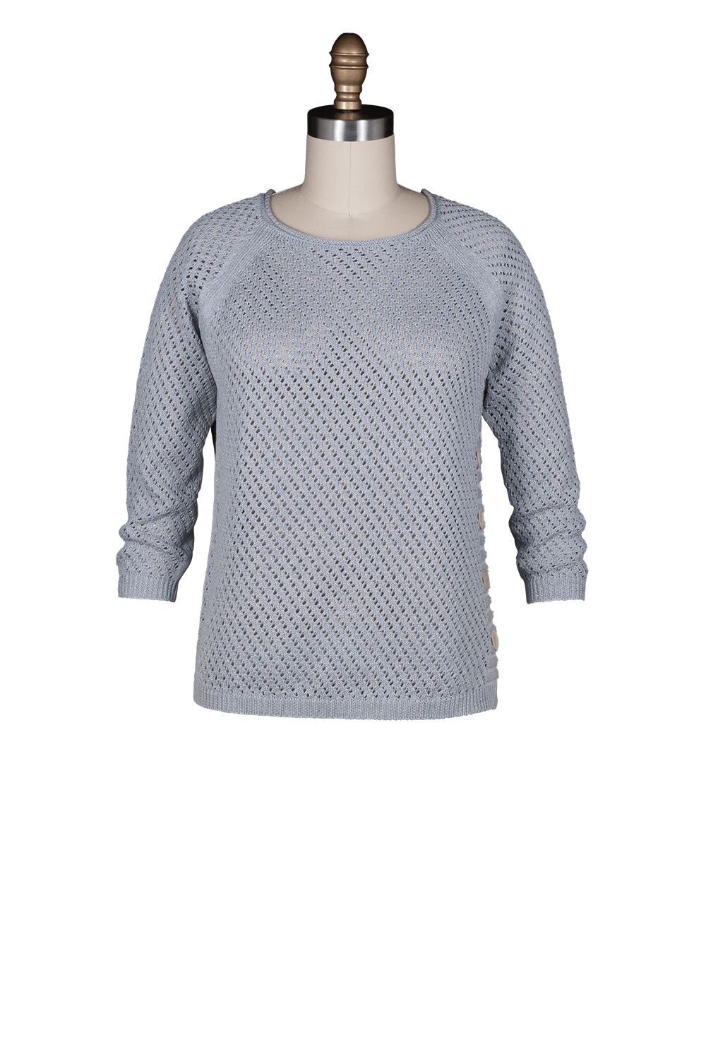 • Open basket weave3/4 sleeve crewneck. Detail of side buttons and pastel cotton metallic yarn.