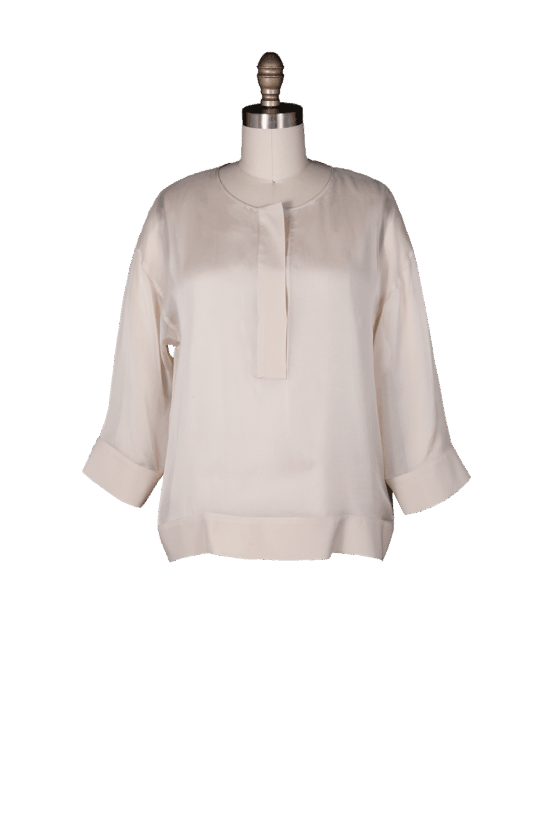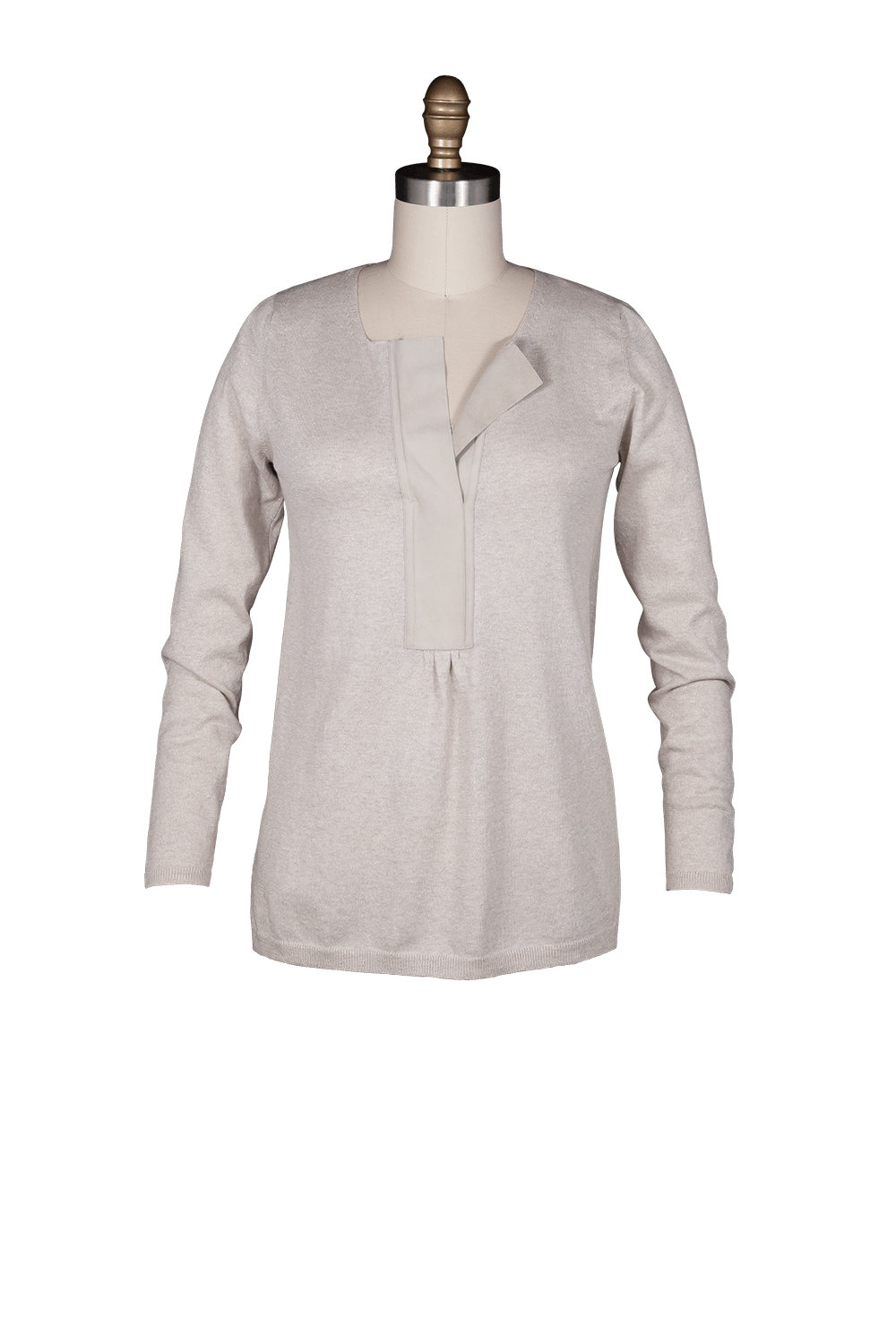 • Pullover long sleeve polo neck sweater with washed sueded leather neck detail. Fine gauge and lightweight knit metallic yarn.